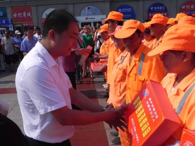圖為:山西同仁康副總經(jīng)理向環(huán)衛工人送上慰問(wèn)品